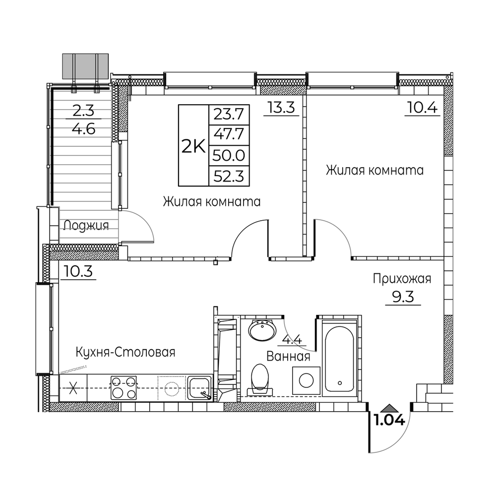 2-комнатная 52.3 м2