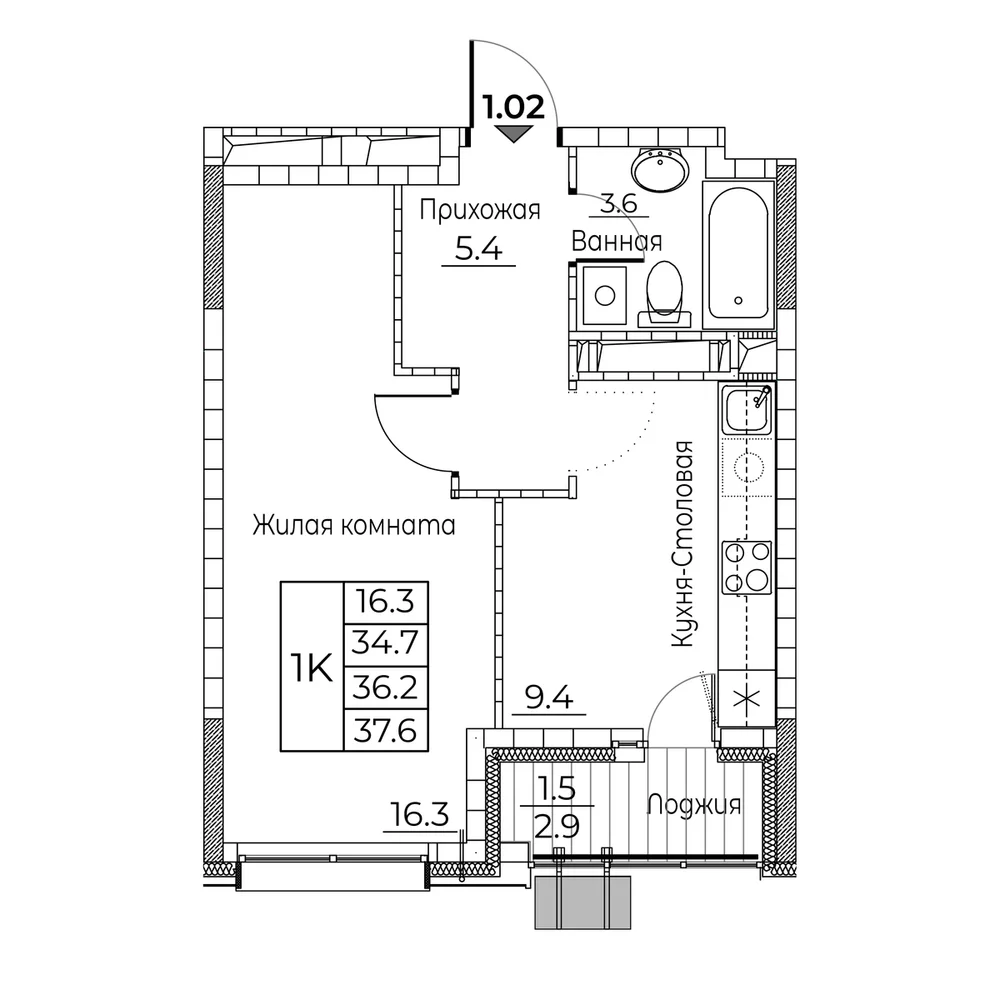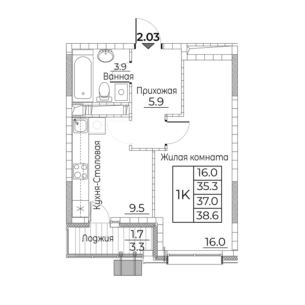 2-комнатная 38.3 м2